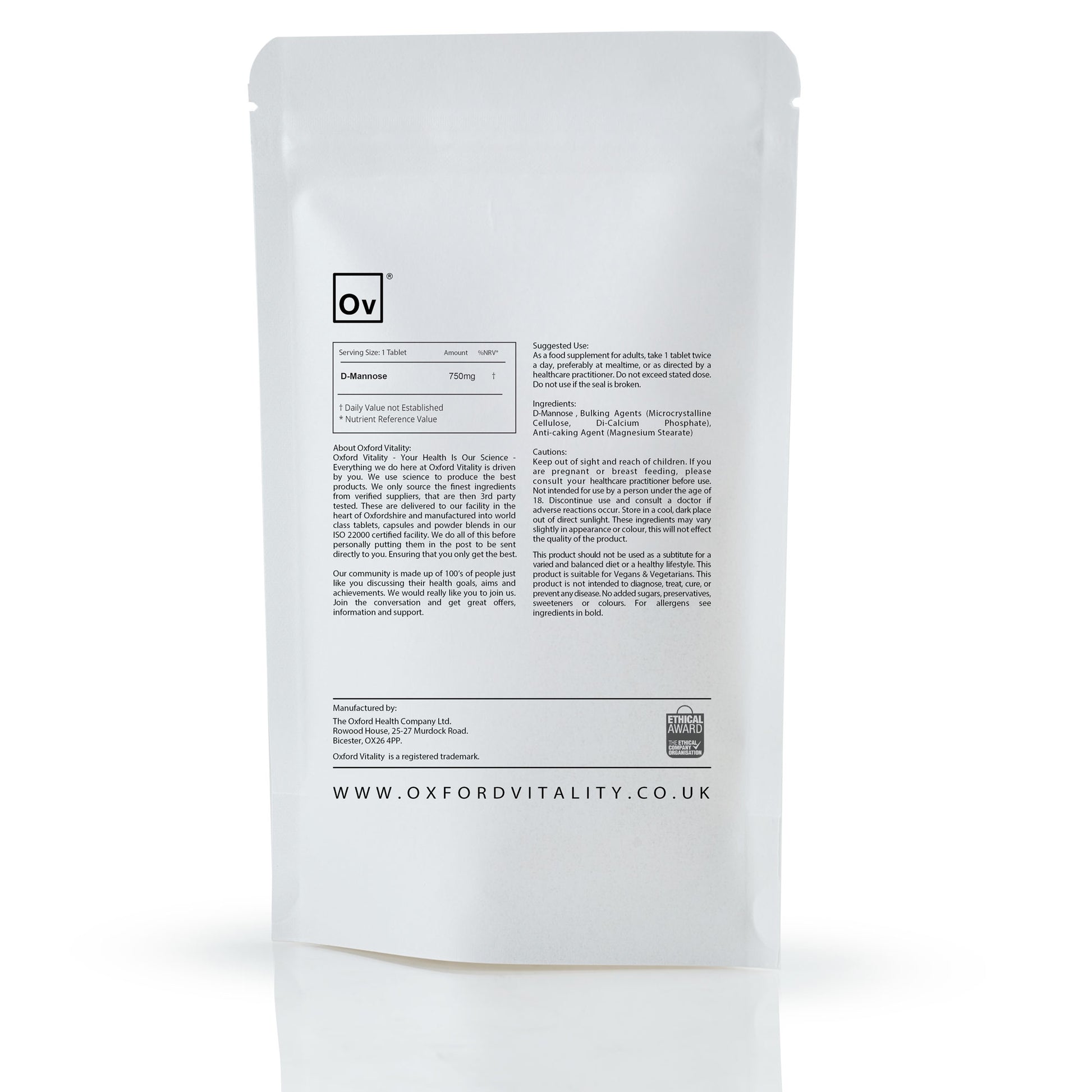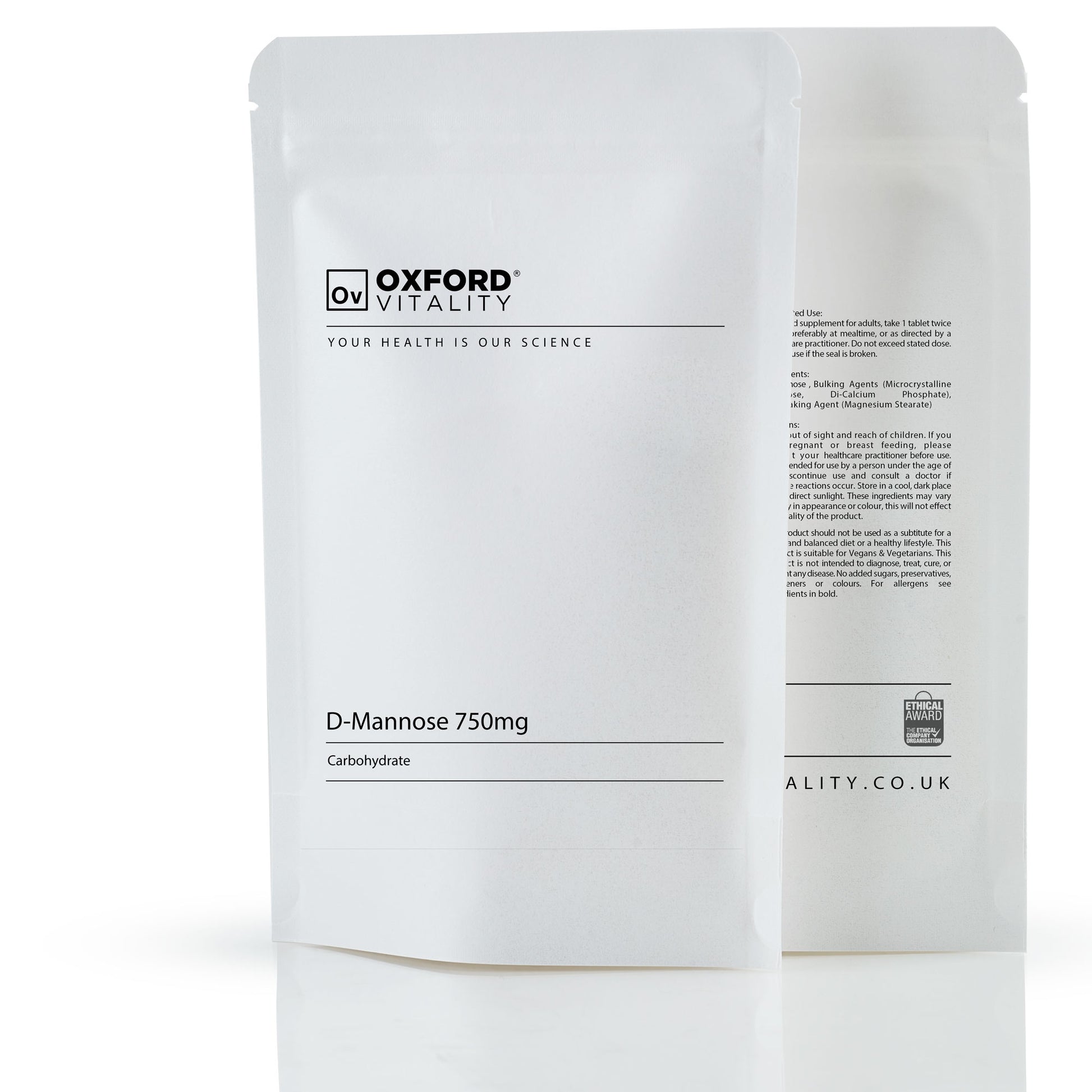 Our D-mannose tablets are fairly large at 18mm in diameter, weighing 900mg in a torpedo style tablet. Each tablet contains 750mg of D-mannose, offering a high strength dose. Oxford Vitality provides four quantity sizes to enable you to choose the best option to suit you.