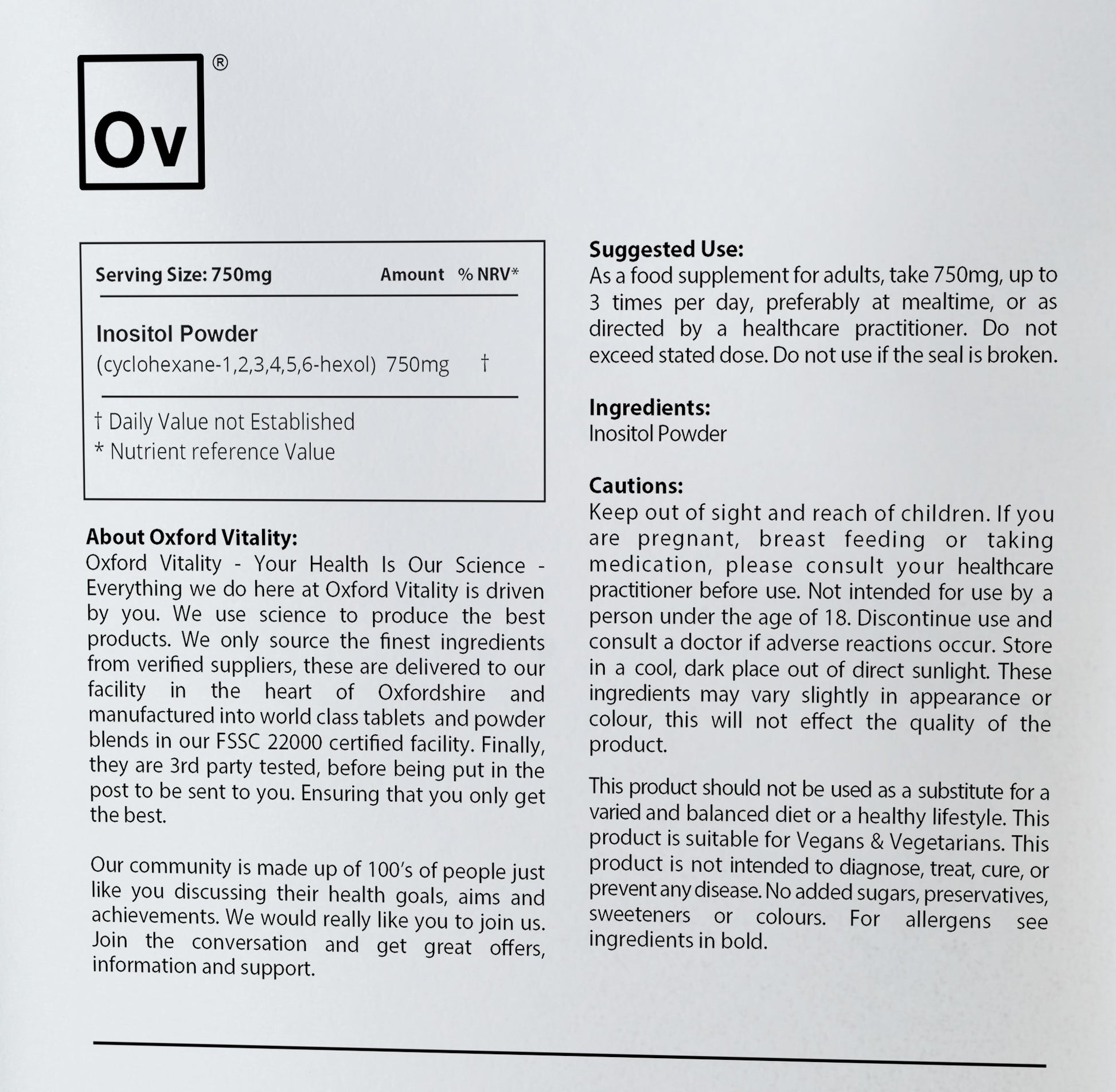 Oxford Vitality offers Inositol in powder form which is useful for those who have problems swallowing. We offer two product sizes to suit your purchasing requirements and we recommend adding our Inositol powder to a smoothie for a nutritious boost.