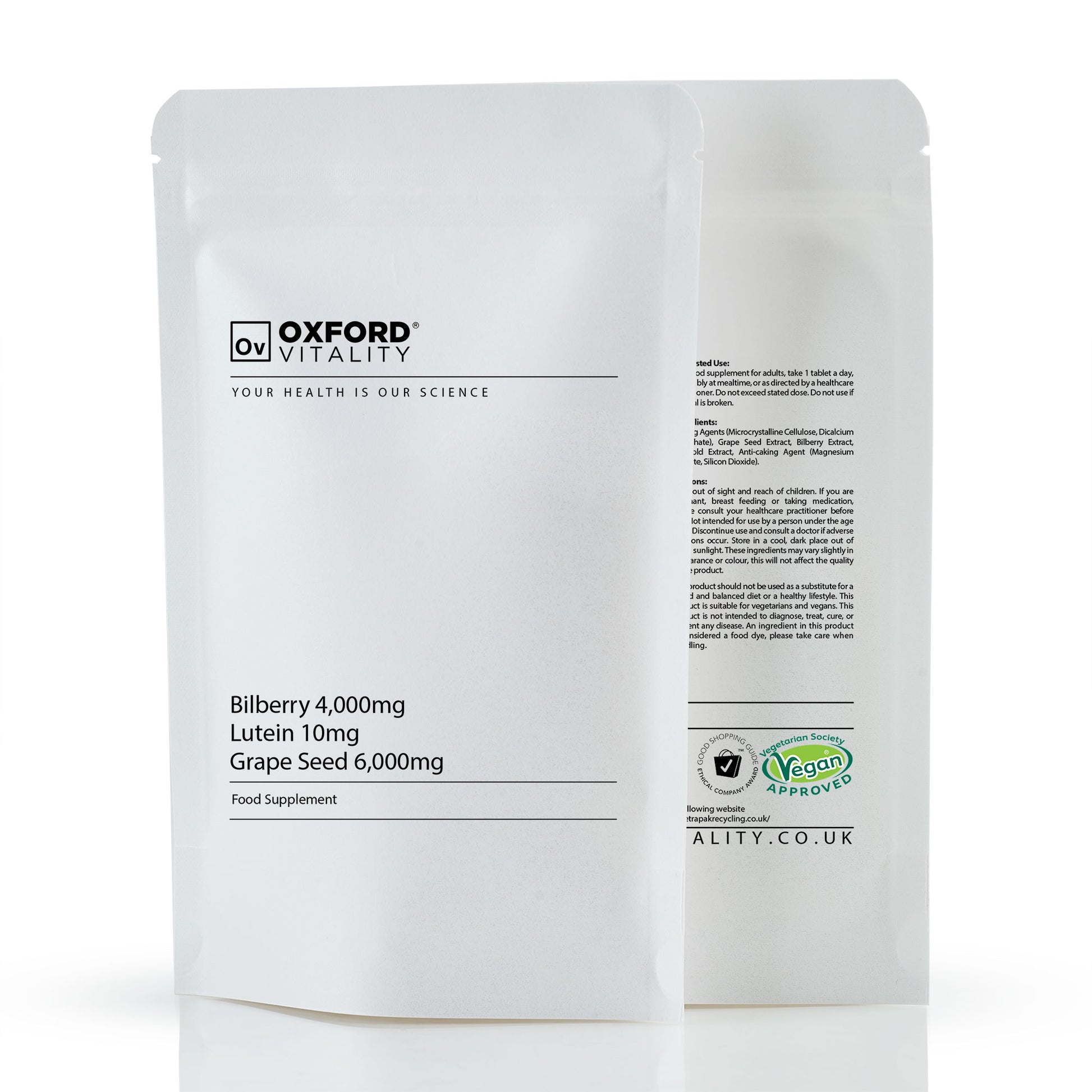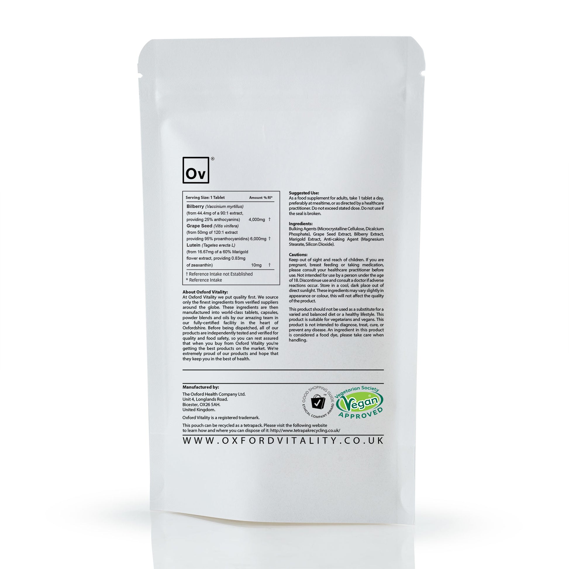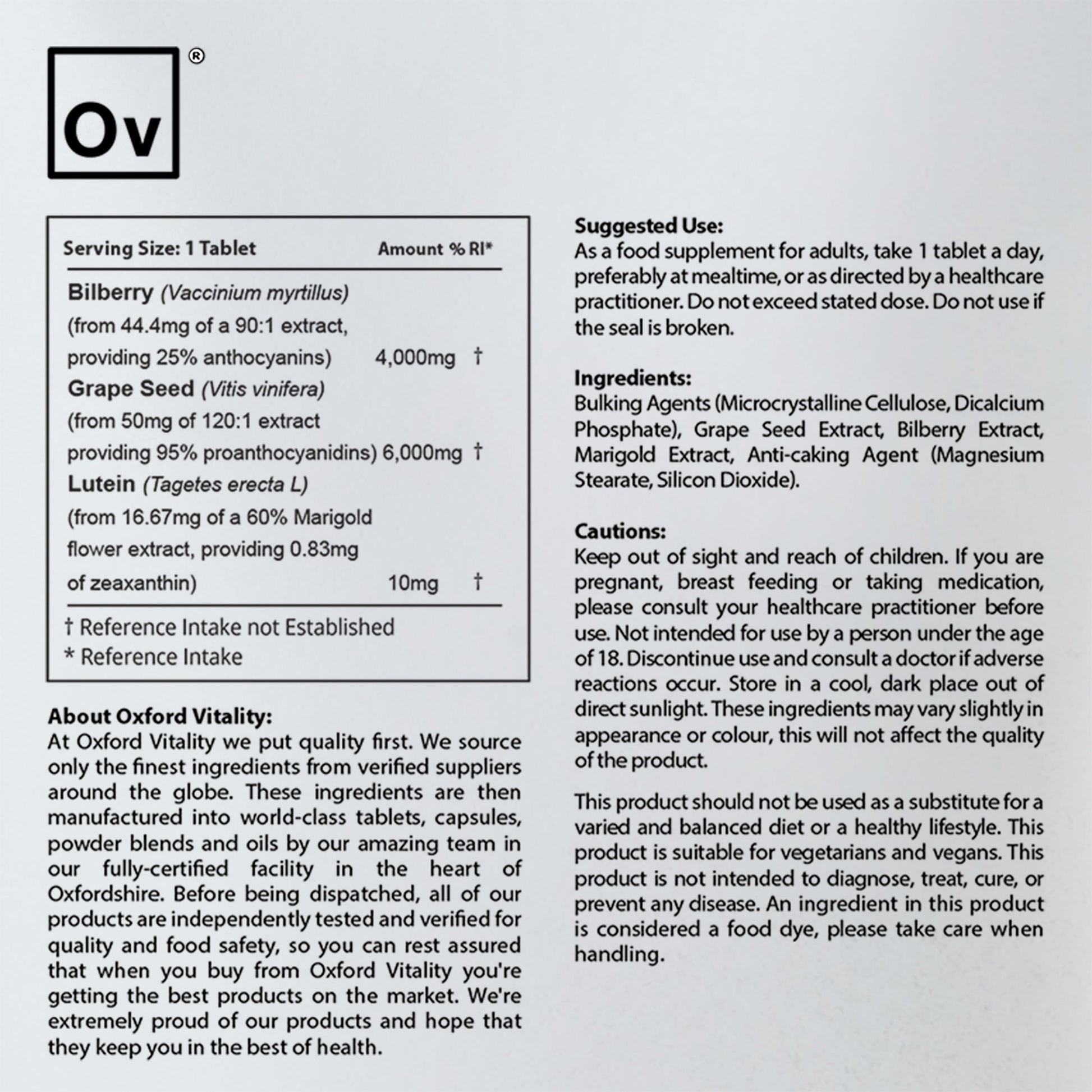 Our OV Vision Care tablets contain a formulation of Billberry extract, Grape Seed extract and Lutein. Each ingredient plays a role in maintaining healthy vision.