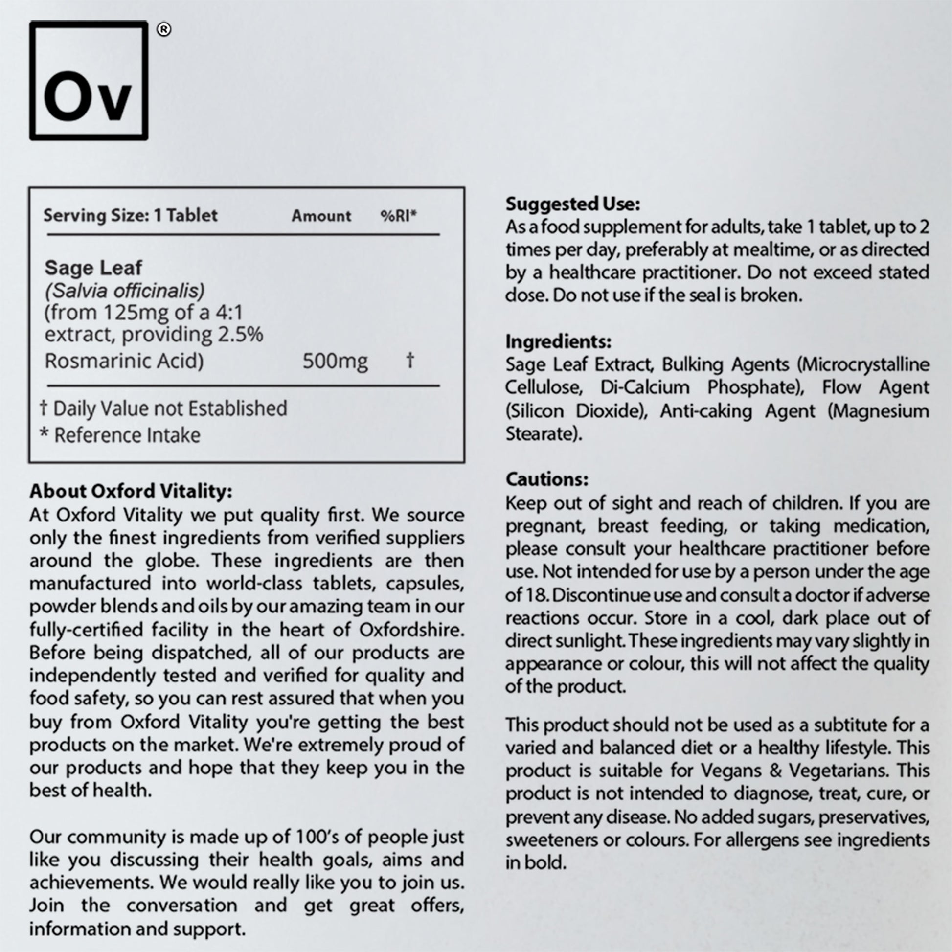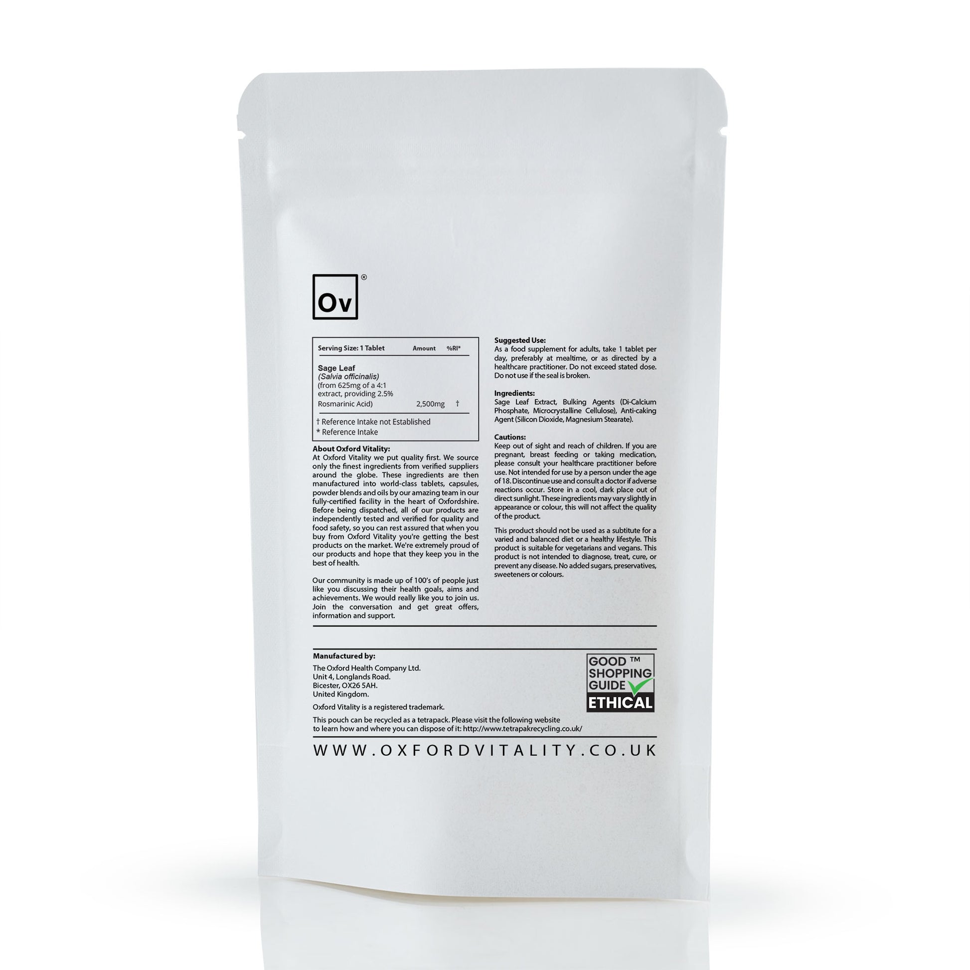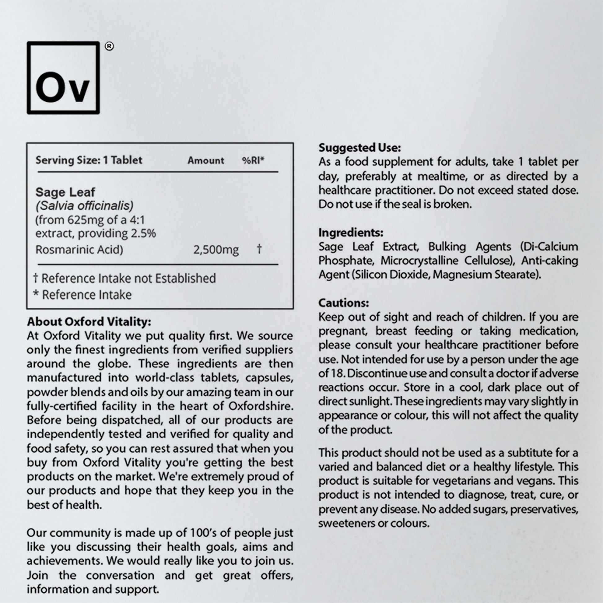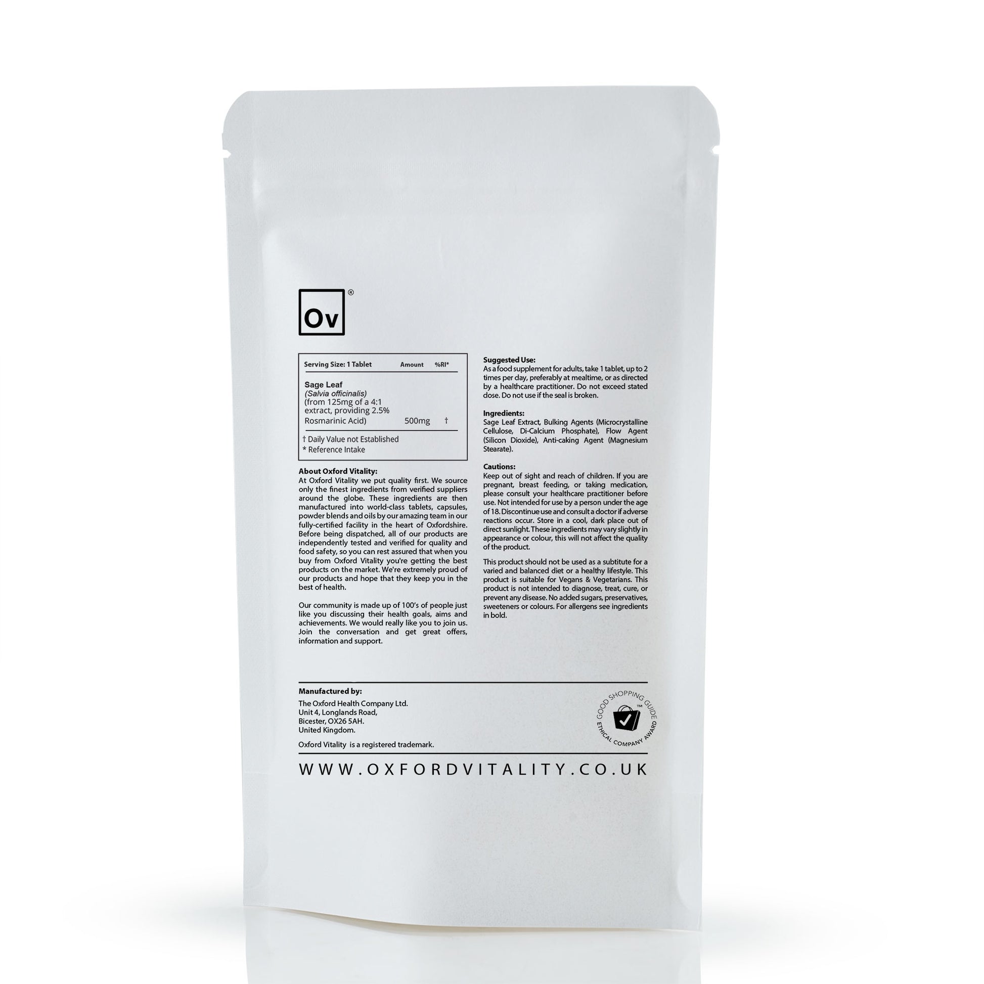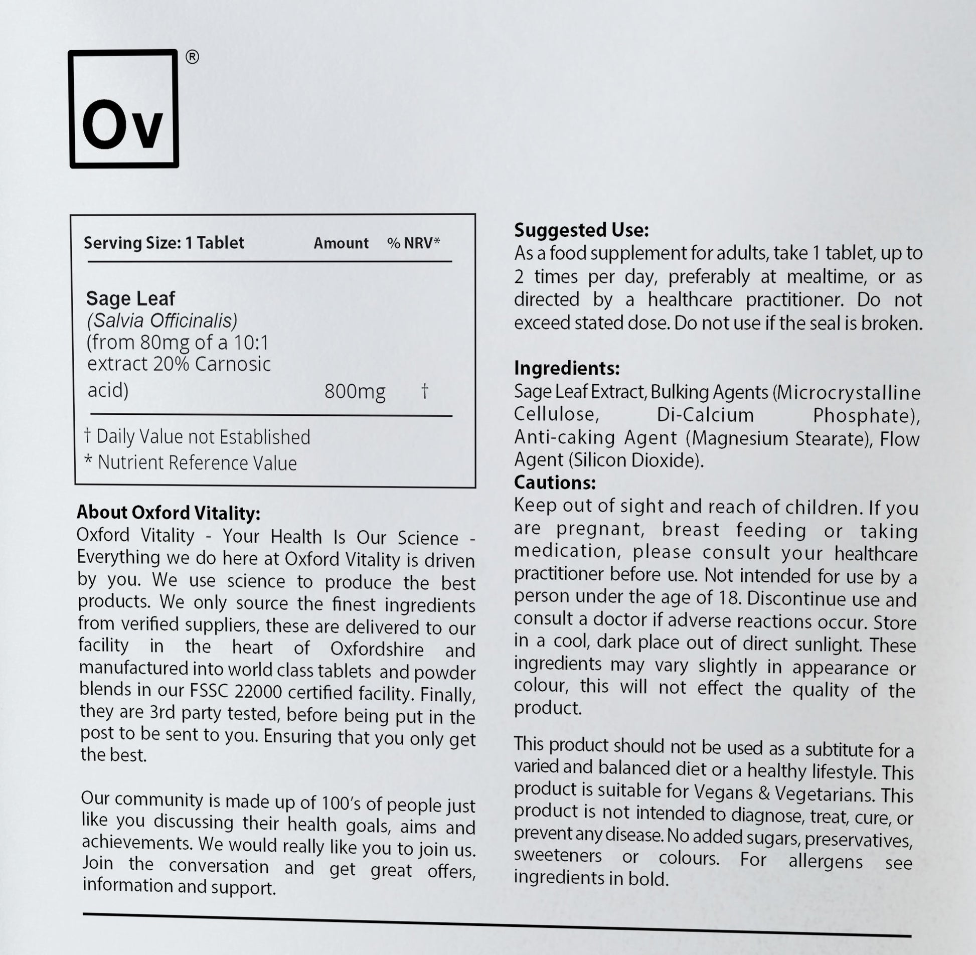 Oxford Vitality offers three strengths of Sage Leaf tablets; 500mg, 800mg and 2,500mg. Each strength is offered in four quantities to meet your purchasing requirements.
