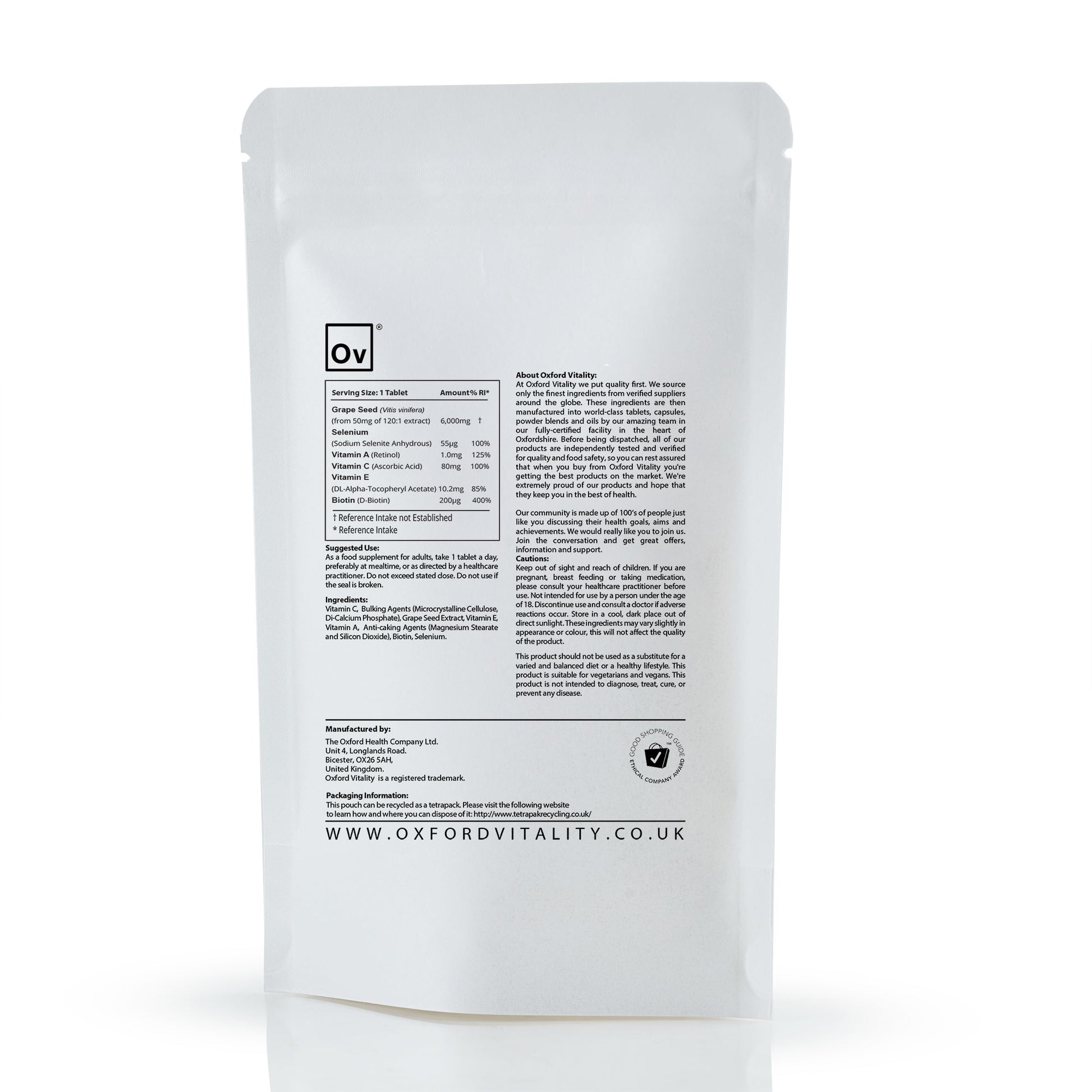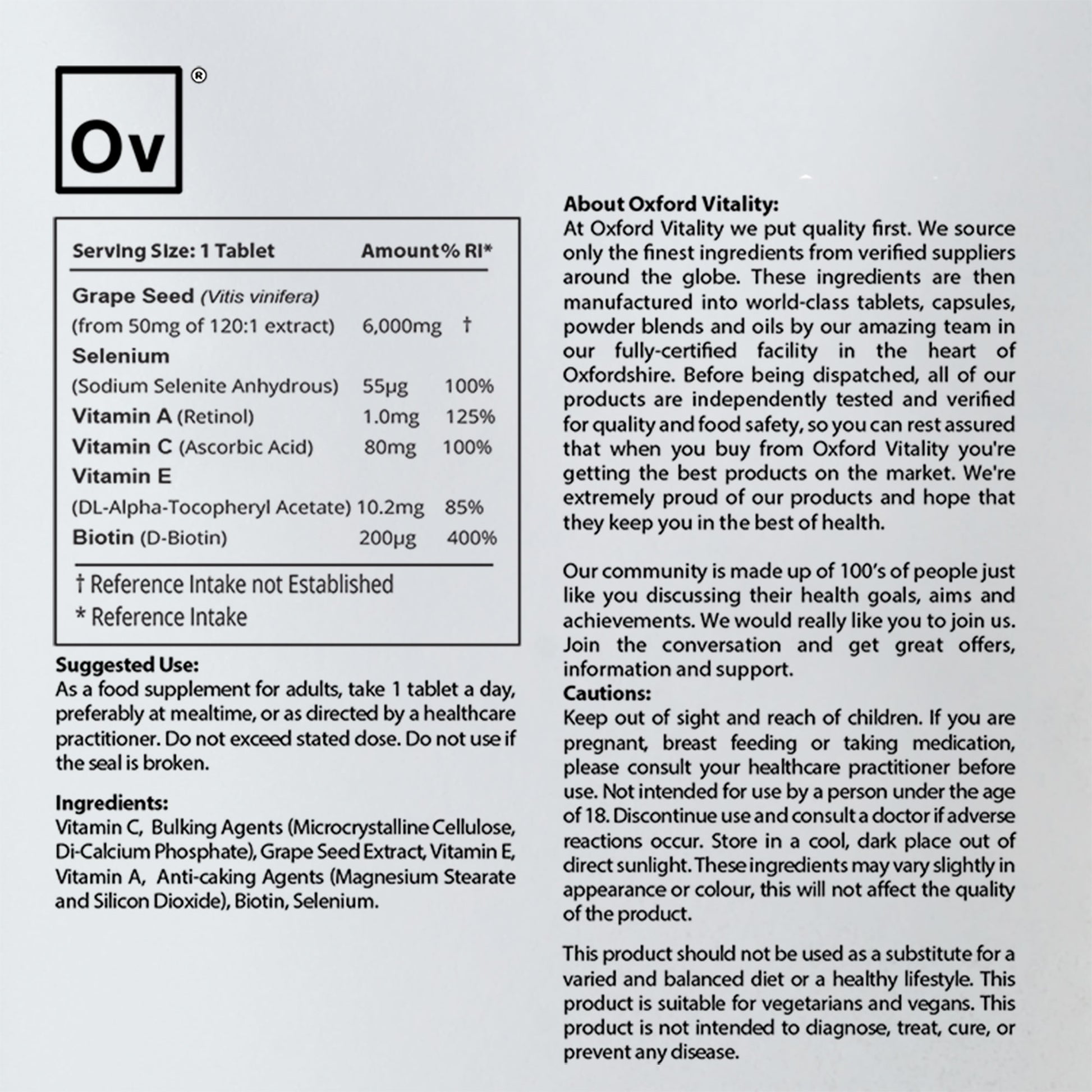 Our Skin, Hair and Nails tablets include a formulation of Grape Seed extract, Vitamin A, Vitamin C, Vitamin E, Biotin and Selenium.